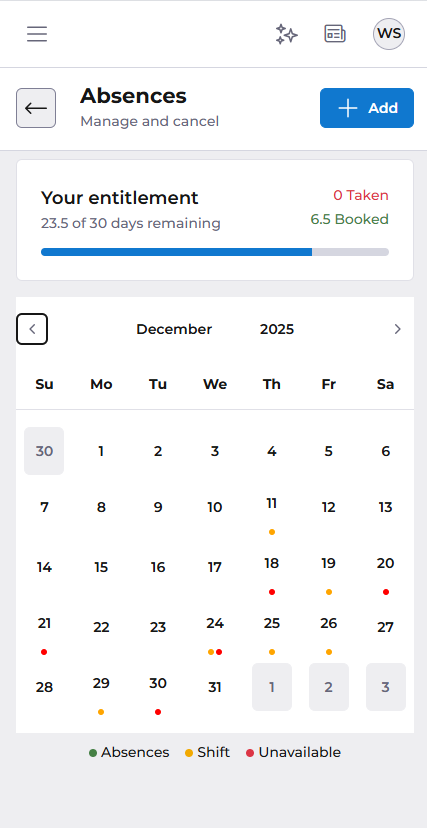Users will have a calendar view showing their shift scheduled days (Shift), any booked Absences (Absences) and any dates where they are unable to book leave due to no remaining leave slots being available (unavailable).