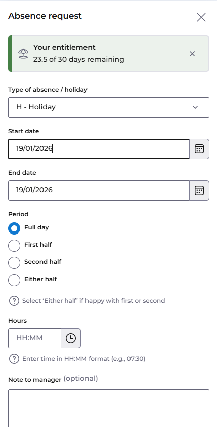 The Type of absence/holiday booking code selection should be controlled from the users profile in Time & Attendance. Once selected and the required dates have been entered, the user can then specify if this is a full day, first half, second half or either half of shift before selecting 'Submit' to send to their manager for approval.