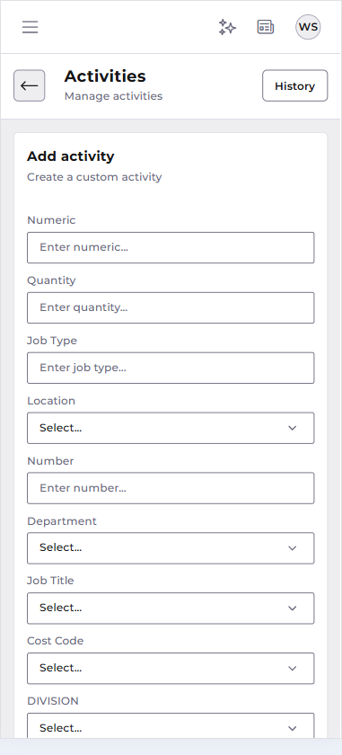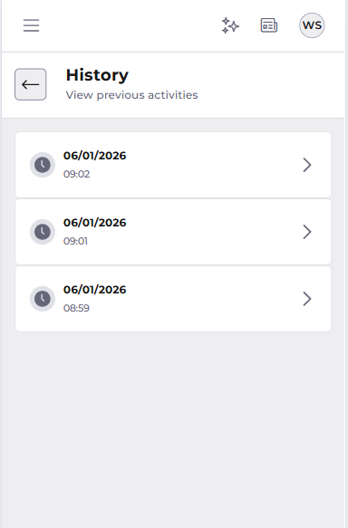 User can access Activity History by using the History button on the Activities screen. This lists the history of logged activities with the most recent record at the top of the list allowing your users to ensure they can track their work activities with ease.