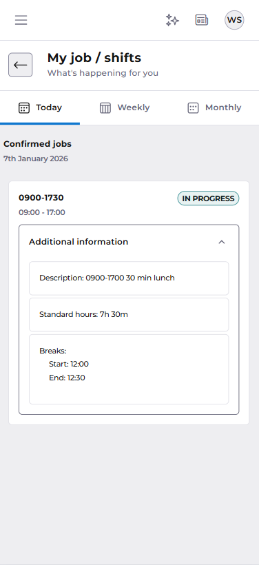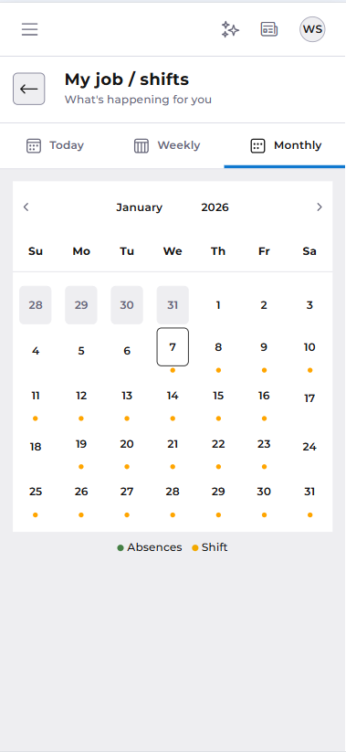 From the Time & Attendance side menu, user will be able to access their schedule. Giving your employees access to Today, Weekly and Monthly views of their scheduled shifts.