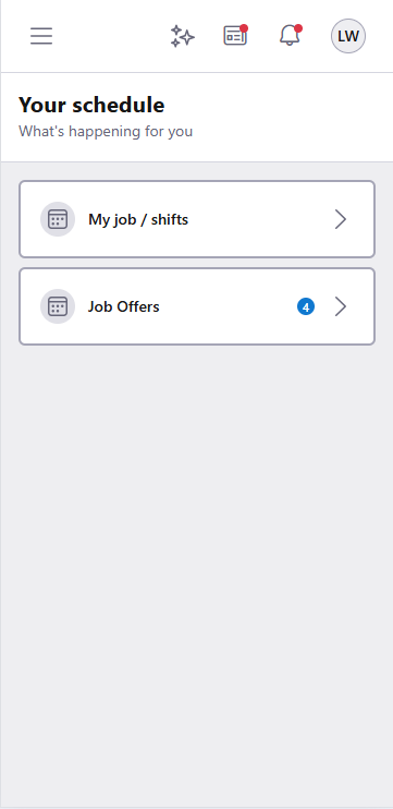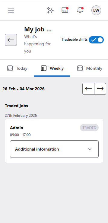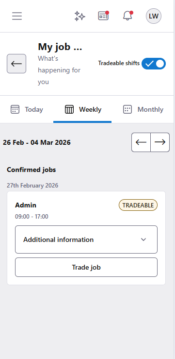 From the My Jobs/Shifts menu a new option has been added to filter schedule to only show 'Tradable Shifts' to the Today, weekly and monthly views along with a description against any shift that is tradable. Once a tradable shift is available the user will have the option to select 'Trade Job'.