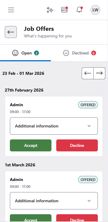 Note: If a scheduled job is declined this will display in the declined tab, if a job offer is declined this will not show in the declined tab for the user.