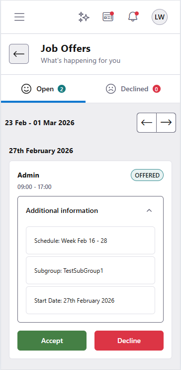 The Accept or Decline buttons can be used to accept or decline the Job offer. For accepted job offers these will be moved into the users schedule.