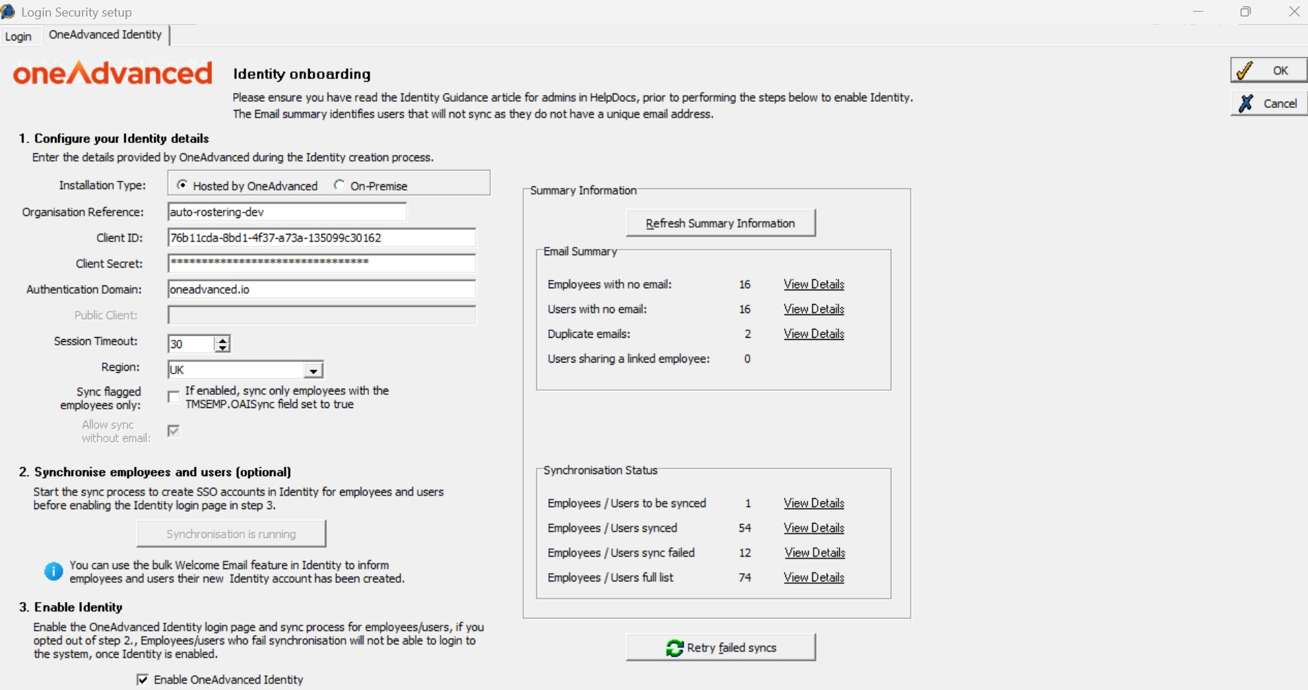 - Once the Enable Identity flag has been set to true, any employees/users that have failed synchronisation will not be able to login to the web/mobile app.