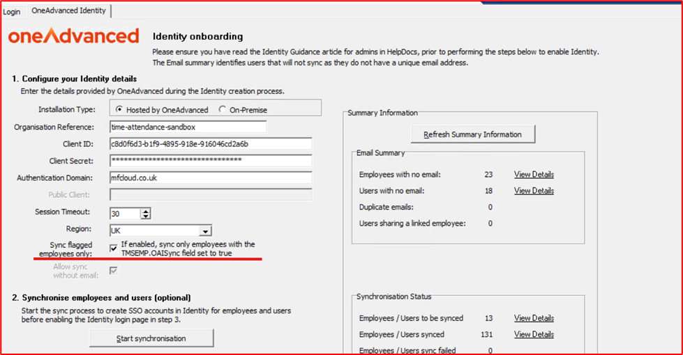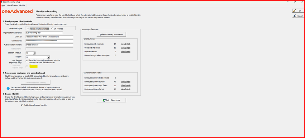 A new field, "Allow Sync without Email", has been added to the OneAdvanced Identity onboarding page in T&A. This allows the use of Identity for employees who don’t have an email address, enabling them to access T&A without an email address.